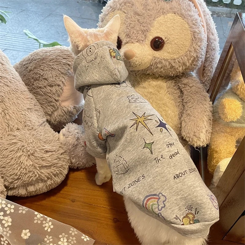 Thick Grey Fleece Hooded Sweatshirt for Sphinx Cat in Winter Long Sleeves Warm Cartoon Kittens Jacket Coat for Devon Rex